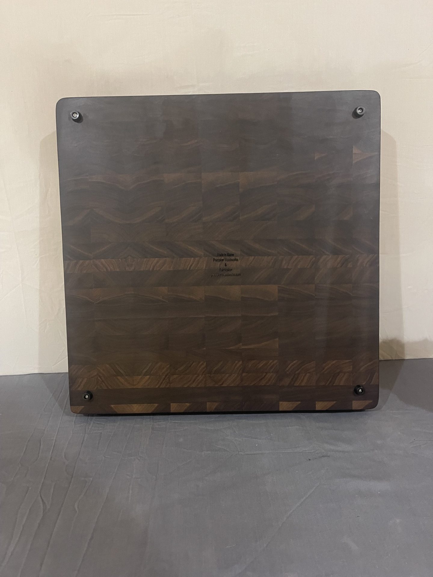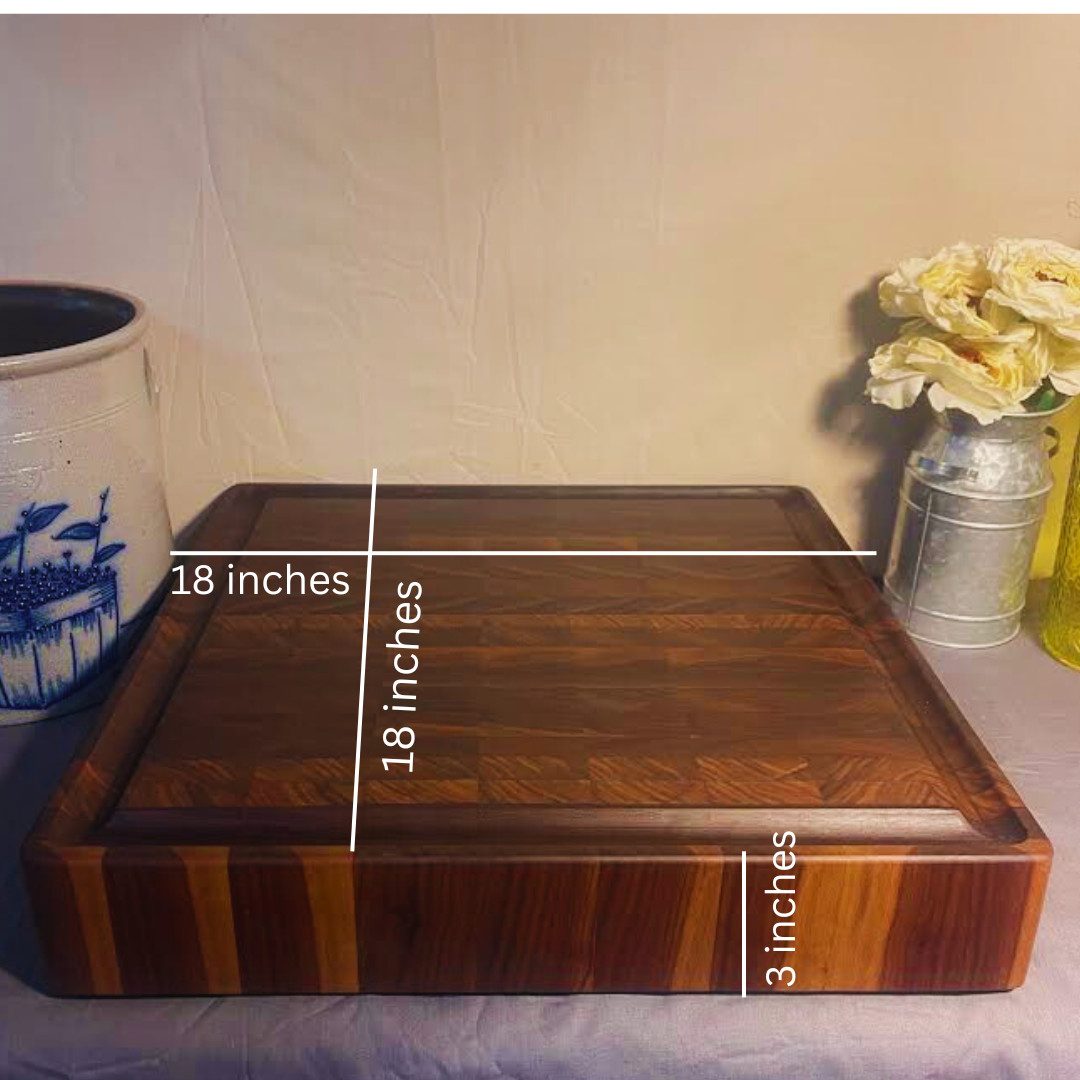- This is solid Walnut End Grain Cutting Board with finger & juice grooves. Also has rubber feet to lessen any movement when in use. Dimensions are 18″X18″X3″ and will last a lifetime of use. Pre Seasoned with food safe cutting board oil and wax. Also Comes with a care kit with additional oil and wax. Ready to use out of the box.