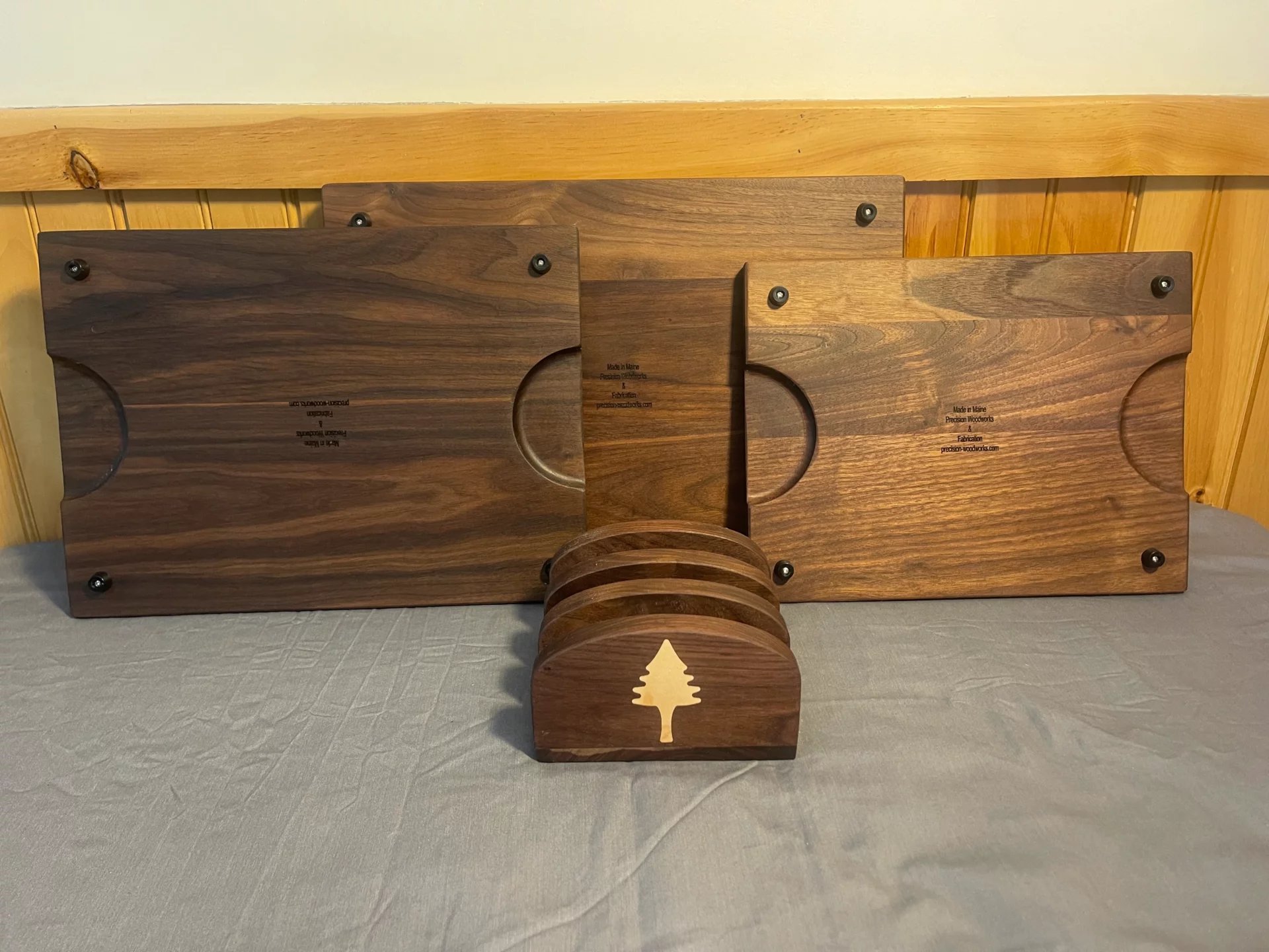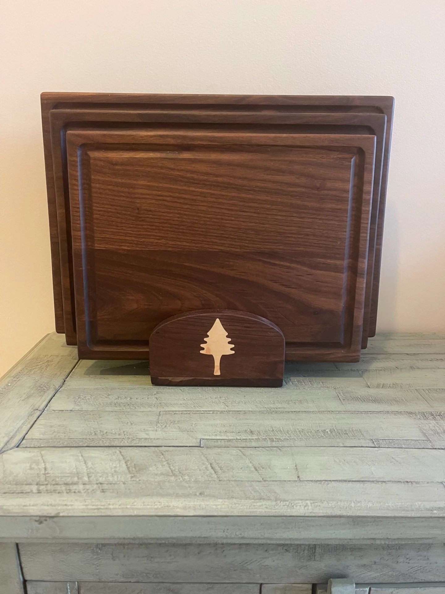 We stock a 4 piece cutting board set available in Walnut or Cherry hardwood with a pine tree inlay in the holder that fits the need of every kitchen. Small board is 10″X13″, Medium board is 11″X15″ & Large board is 12″ X 17″. All 3 boards have Rubber feet to avoid slipping and also have finger handles that make it east to pick up from the table. Boards are pre seasoned with food safe cutting board oil ready to use out of the box! Price is $280.00 and shipping is free anywhere in the continental US.