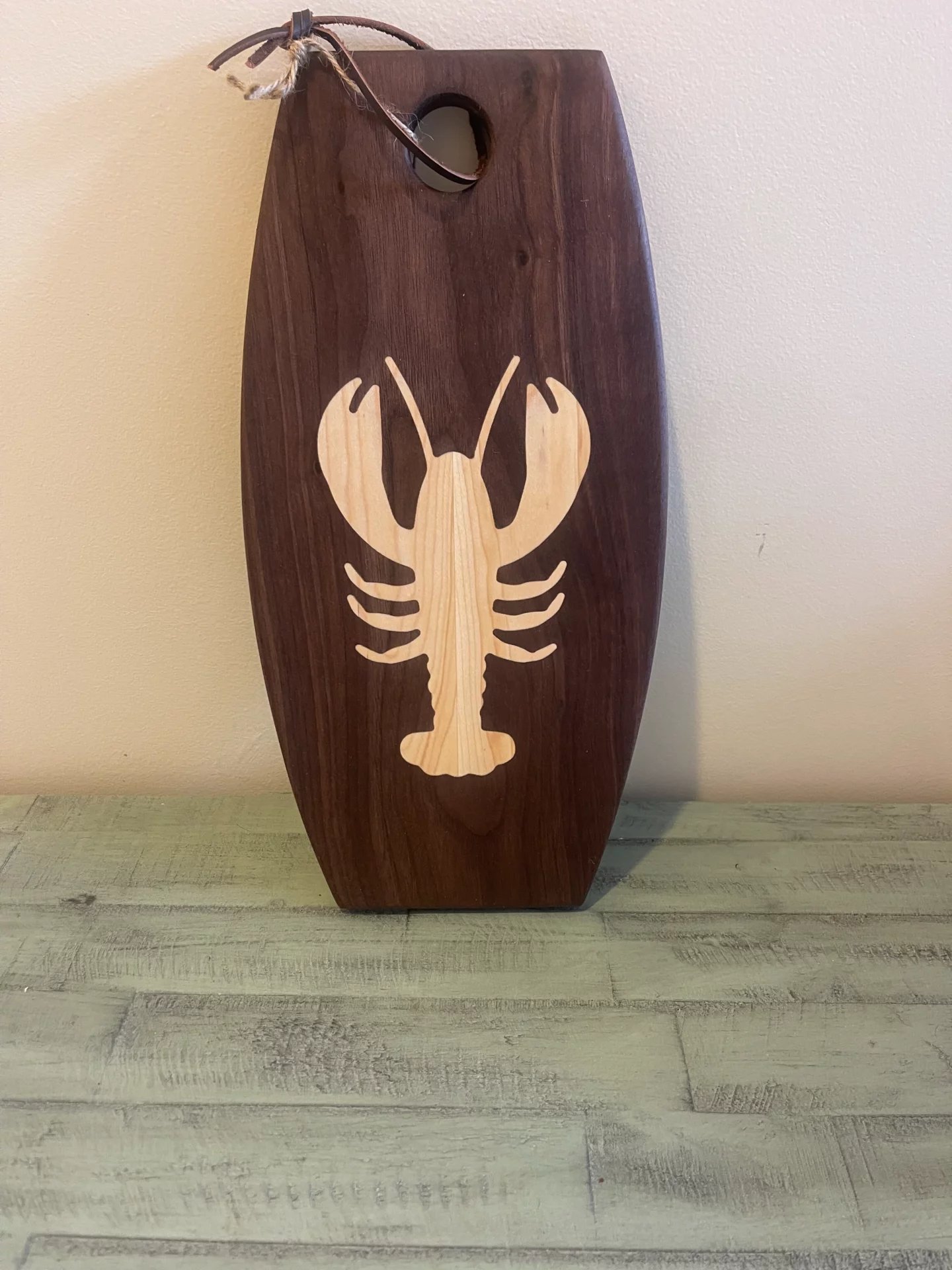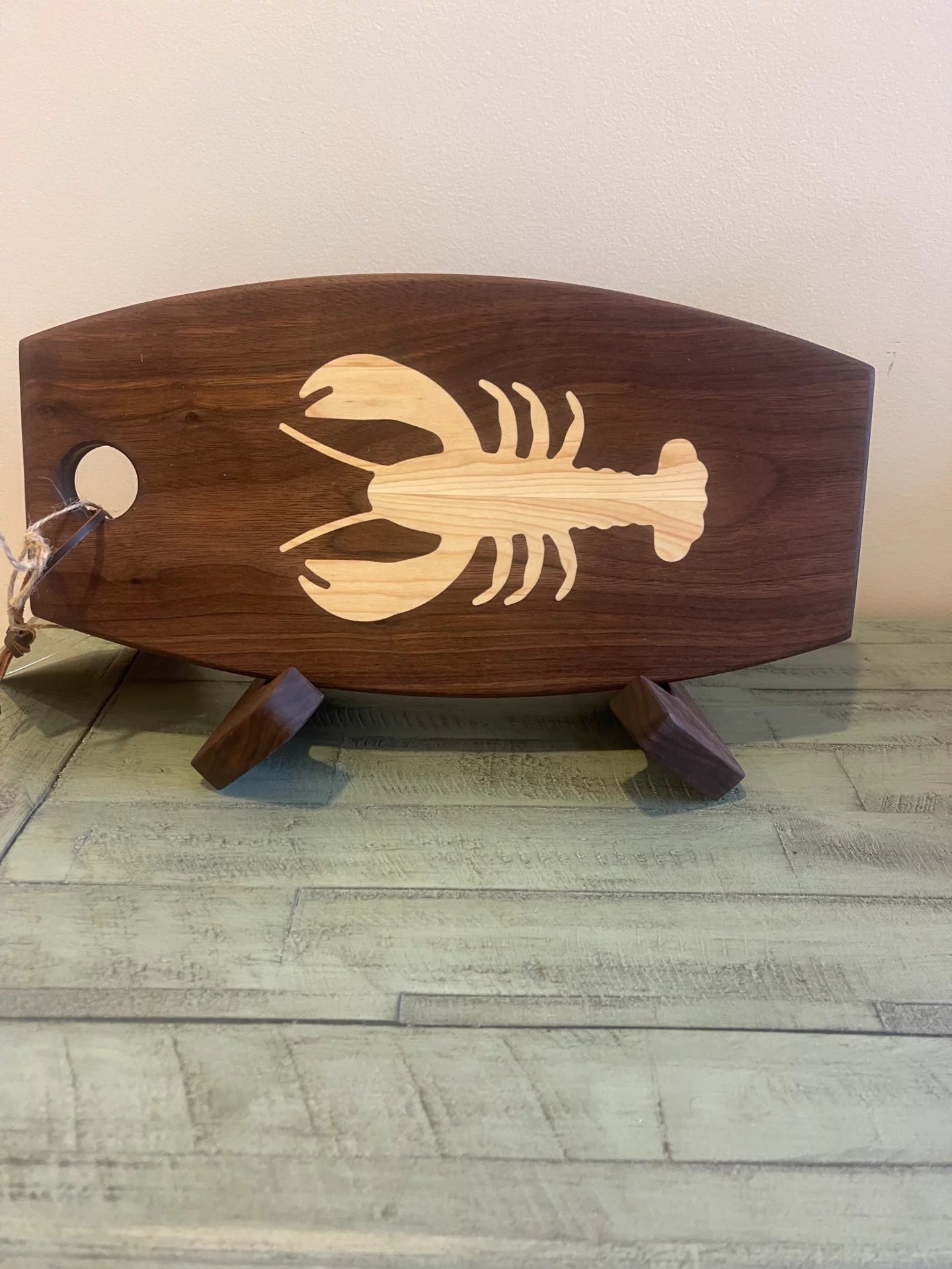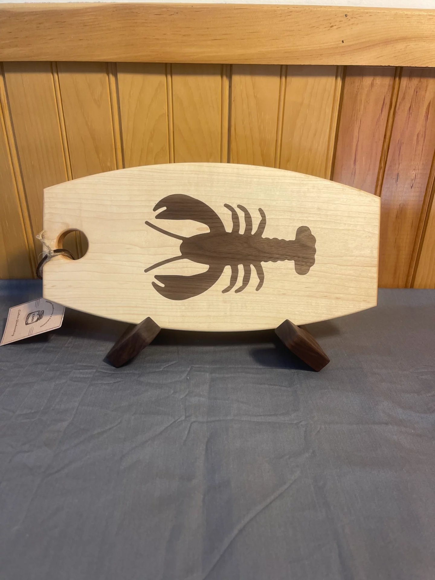 We do custom shop boards with wood inlays ready for the store shelves or use in you home. These type of boards can be shipped with a wood holder. Board is 7″X14″ and we stock lobster & Moose but we also do ANY state as well. We offer these in Walnut with Maple inlay, Maple with Walnut inlay and Cherry with Walnut inlay. Boards are $70.00 each. Holders are $20.00 each or buy the board and holder for $80.00
